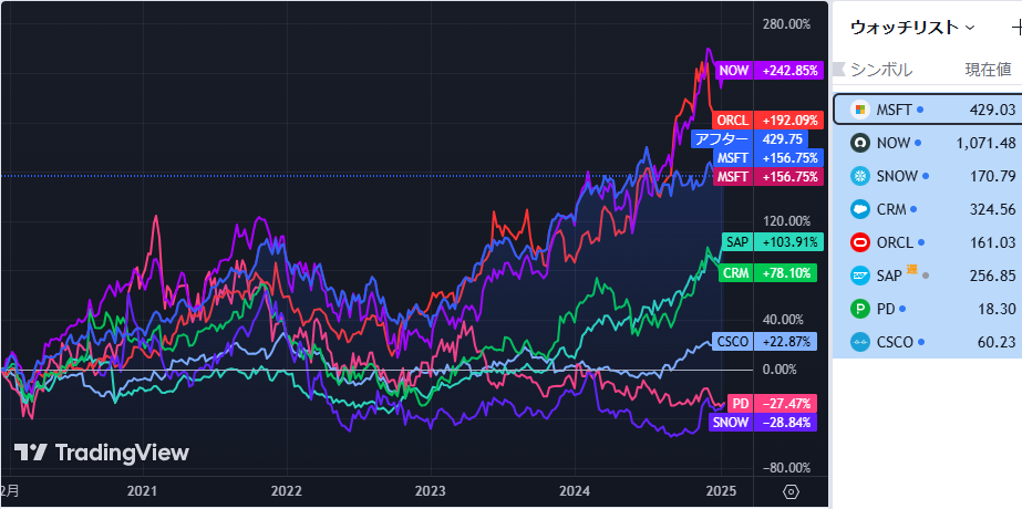 Servicenow(NOW)に軍配があがりました。FANG+の雄マイクロソフトをしのぐパフォーマンスです。そしてDB王者Oracle(ORCL)。Javaも配下に入れ、勢い衰えないプラットフォーマーとして君臨しています。領域ライバルのsnowflakeは新興勢にしては一時期より元気が戻らず低迷気味です。