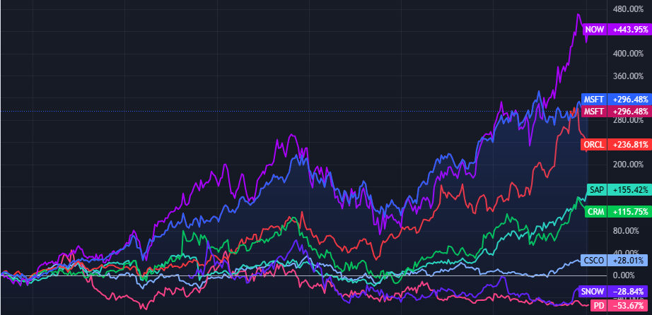 Servicenow(NOW)に軍配があがりました。FANG+の雄マイクロソフトをしのぐパフォーマンスです。そしてDB王者Oracle(ORCL)。Javaも配下に入れ、勢い衰えないプラットフォーマーとして君臨しています。領域ライバルのsnowflakeは新興勢にしては一時期より元気が戻らず低迷気味です。